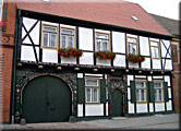 | Viele sehenswerte Fachwerkbauten säumen die Straßen und Gassen. Geschnitzte Verzierungen an den Hauseingängen verraten manches über die Geschichte der Häuser und ihrer Besitzer. |